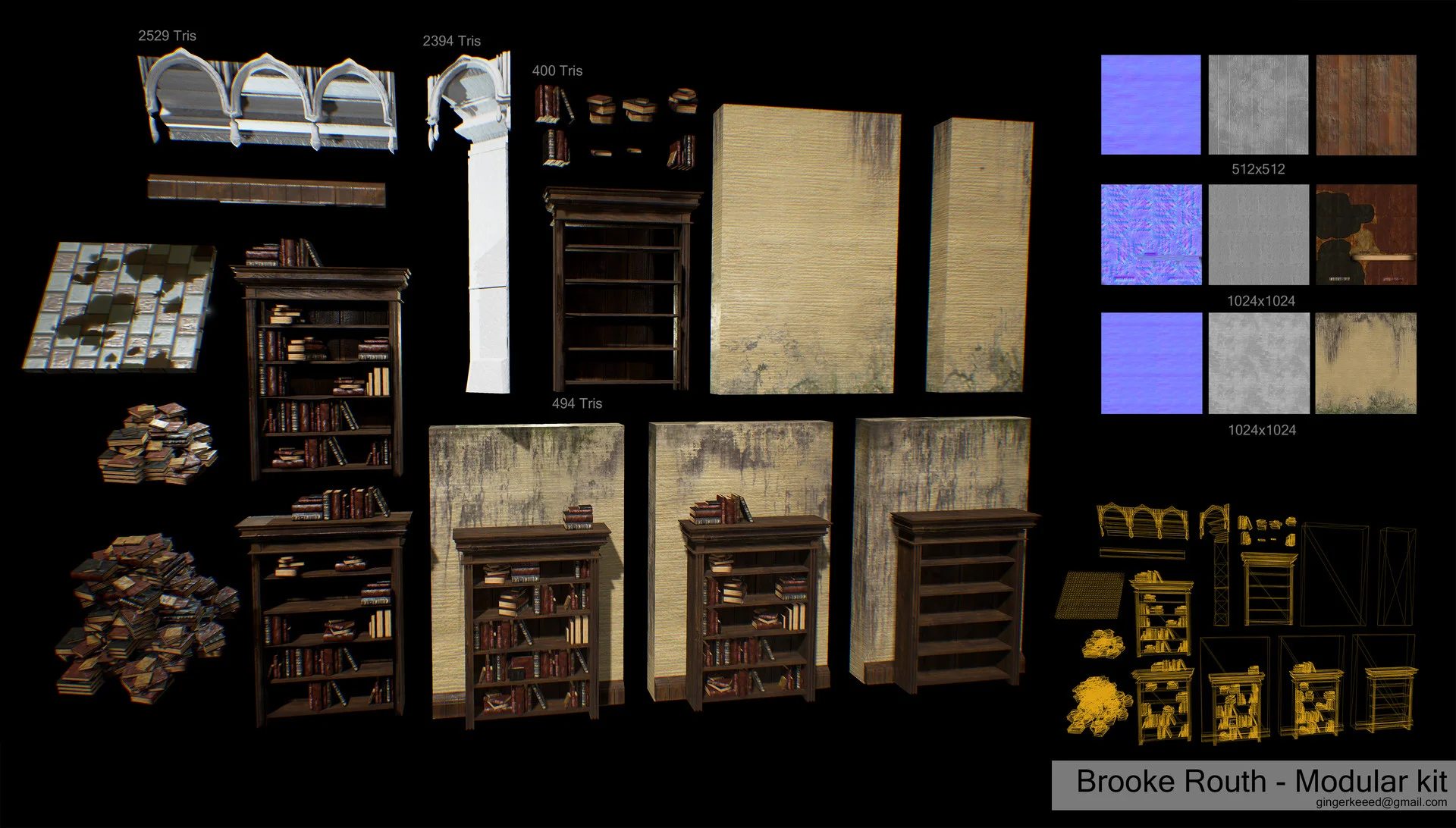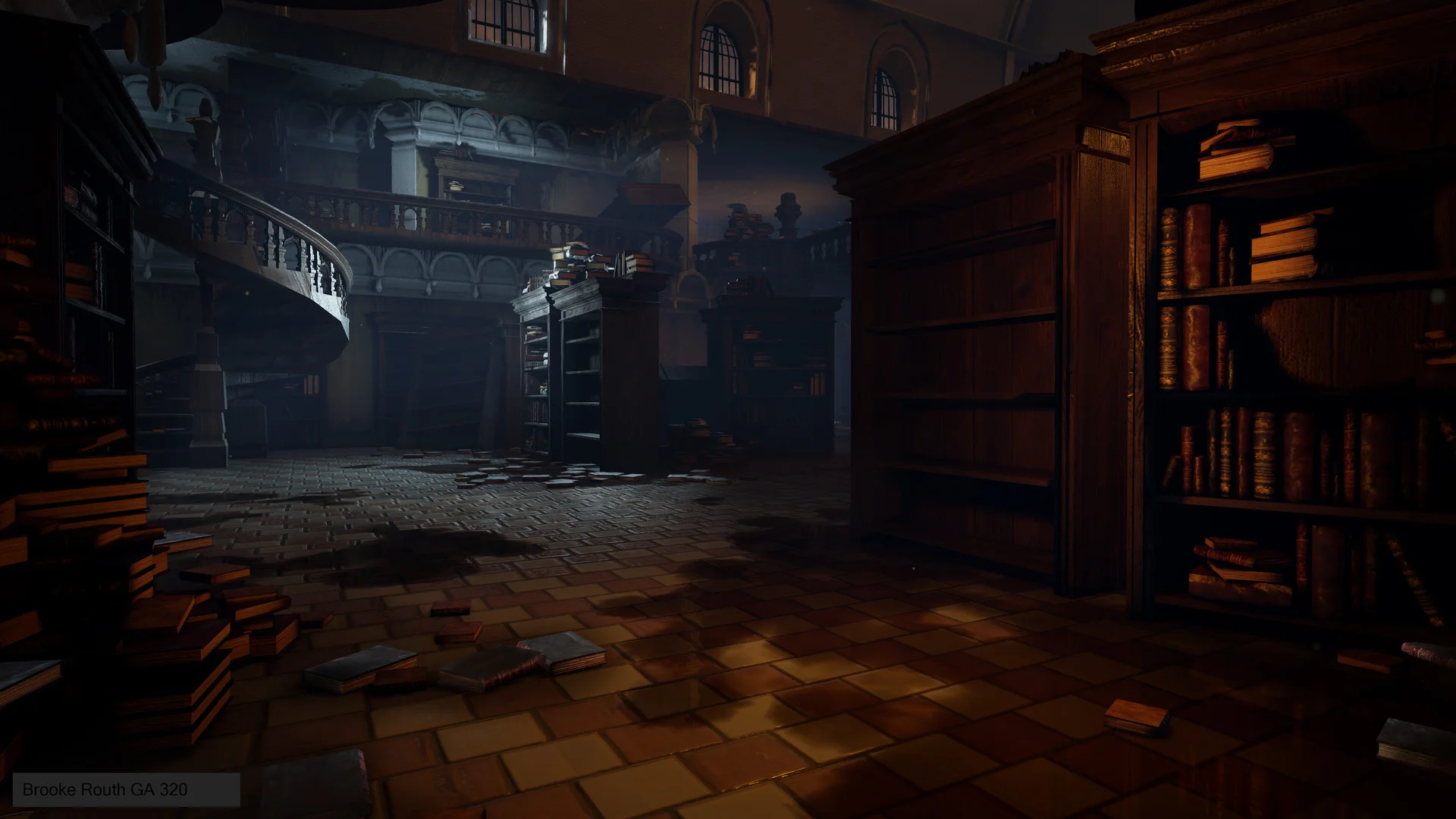 Modular environment created to feel dark, damp, and destroyed. This is an 1800's library just after a disastrous hurricane swept through the area, leaving books scattered and the library water logged. The tiles are vertex painted to give the floor more life, and the ceilings are waterlogged.